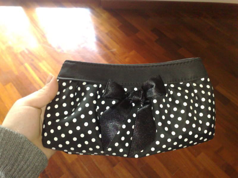 Borsina portatrucco,utilizzabile anche come pochette, nera a pois bianchi con fiocchetto in raso nero acquistata da Claire's a Londra.Usata poco come portatrucco, cedo a 10 euro (ss escluse)